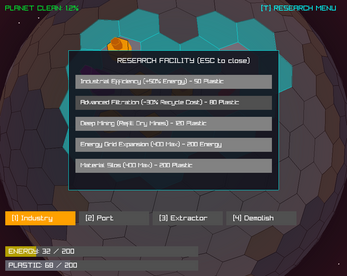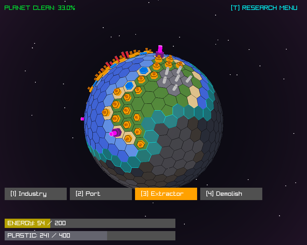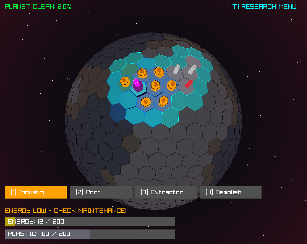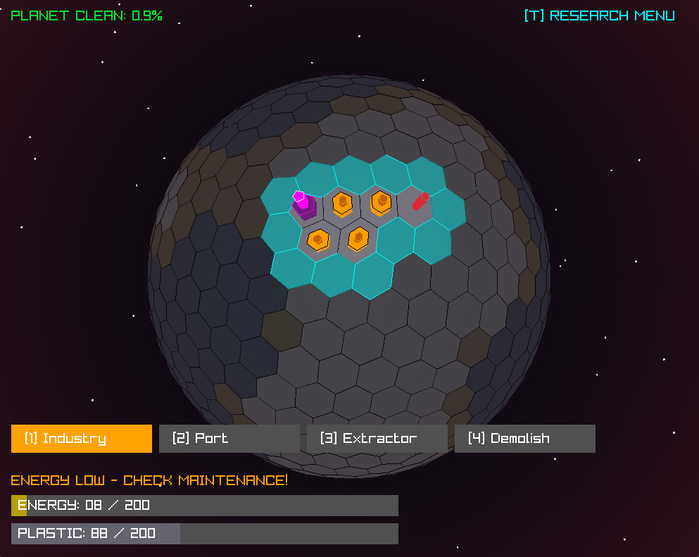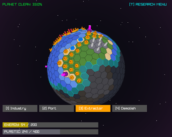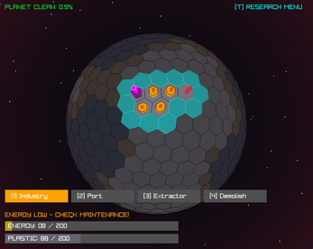 Extractors: These extract plastic out of rocky land (grey) and turn red when all of the plastic of that tile has been extracted. You can also hover over them to see how much is left. They cost 25 energy and 0 plastic to build.